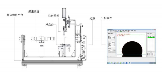如上圖、按觸角測量儀主要由光源、注射單元、樣品臺、采集系統、整體傾斜平臺、分析